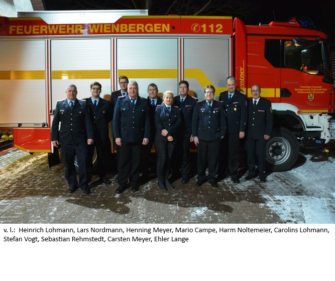 Ortsbrandmeister Heinrich Lohmann konnte neben Gemeindebrandmeister Carsten Meyer, dem stellvertretenden Gemeindebrandmeister Sebastian Rehmstedt und dem stellvertretenden Brandschutzabschnittsleiter Nord Ehler Lange zahlreiche Mitglieder der Ortsfeuerwehr, der Nachbarfeuerwehren und der Verwaltung bei der Jahreshauptversammlung der Ortsfeuerwehr in Dorfgemeinschaftshaus begrüßen. Nach einem gemeinsamen Essen und der Ehrung der verstorbenen Mitglieder folgt der Jahresbericht des Ortsbrandmeisters. Derzeit verfügen die Wienberger über neunundvierzig Aktive, davon dreizehn Frauen, sieben Aktive werden in Zweitmitgliedschaft geführt. Fünfundzwanzig ehemals Aktive gehören der Altersabteilung an. Weiter berichtete der Ortsbrandmeister von zwei Großbränden, diversen Kleinbränden, sieben Vorsorgealarmen durch Auslösung von automatischen Brandmeldeanlagen und dem ersten Einsatz der Höhenrettungsgruppe (ERHT), der allerdings kurz nach dem Ausrücken abgebrochen wurde. Tanja Tümler, Jonas Wiemann und Holger Homfeld wurden für die beste Dienstbeteiligung ausgezeichnet. Harm Noltemeier wurde zum Hauptfeuerwehrmann befördert und Caroline Lohmann trägt nun den Dienstgrad erste Hauptfeuerwehrfrau. Nachgereicht wurde die niedersächsische Hochwassernadel an Mario Campe, Lars Nordmann, Caroline Lohmann und Henning Meyer. Durch die Auflösung der Feuerwehr Hilgermissen konnte die Wienberger Feuerwehr einen Zuwachs von acht Aktiven und zwölf Mitgliedern in der Altersabteilung verbuchen. Die Teilnahme an verschiedenen Wettbewerben, ein erste Hilfe-Lehrgang, Teilnahme an der Kreisbereitschaftsübung, eine Fortbildungsveranstaltung für Führungskräfte sowie die Belegung einiger Lehrgangsplätze rundeten die Tätigkeiten im Berichtsjahr ab. In der Folge berichteten Gruppenführer und weitere Funktionsträger aus ihren Bereichen. Sven Lässig konnte unterjährig als neues aktives Mitglied aufgenommen werden. Gemeindebrandmeister Carsten Meyer und sein Stellvertreter Sebastian Rehmstedt berichteten über eine zufriedenstellende Personallage, über den Stand des Feuerwehrbedarfsplans, Einsätzen und Lehrgängen im abgelaufenen Jahr und gaben einen Ausblick auf Planungen und Aktivitäten im laufenden Jahr. Der stellvertretende Brandabschnittsleiter Ehler Lange informierte die Versammlung über Neuigkeiten aus der Kreisfeuerwehr und Samantha Lohrberg, als Vertreterin des Rathauses, überbrachte Grüße der Verwaltung und zollte den Wehrleute ihre Anerkennung ihren Respekt für ihre ehrenamtliche Tätigkeit.