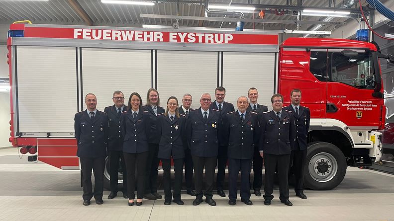 Etwas Besonderes stellte das Jahr 2025 für die Ortsfeuerwehr Eystrup nach Aussage des Ortsbrandmeisters Jan Brinkmann dar. Am 14. November konnten mit über 100 geladenen Gästen das neue Feuerwehrgerätehaus und die zwei neuen Fahrzeuge TLF 3000 und LF 20 übergeben werden. Auch wenn das vergangene Jahr mit 33 Einsätzen unterdurchschnittlich war konnten sich die Eystruper über Arbeitsmangel nicht beklagen. 48 Aktive sind in der Einsatzabteilung mit einem Altersdurchschnitt von 38,41 Jahren, davon 7 weiblich, die Altersabteilung zählt 23 Mitglieder, von 27 Mitgliedern der Jugendfeuerwehr sind 11 aus Eystrup, 5 von 30 Kindern gehören zur Kinderfeuerwehr und 211 Mitbürger unterstützen die Feuerwehr fördernd. 15 Brandeinsätze, 2 Fehlalarme, 1 Brandsicherheitswache und 15 Hilfeleistungen waren im abgelaufenen Jahr abzuarbeiten. Bei 262 Fahrten wurden 5431 km unfallfrei zurückgelegt. Hier galt der Dank des Ortsbrandmeisters den Fahrern und Maschinisten und dem Gerätewartteam Arne Brinkmann, Simon Bockhardt und Till Grimmelmann. Aus – und Weiterbildung nahmen im vergangenen Jahr einen breiten Raum ein. 8 Lehrgangsplätze wurden auf Samtgemeindeeben besetzt, 21 auf Kreisebene sowie 5 auf Landesebene. In der Ortswehr lag der Fokus der Ausbildung bei den beiden neuen Fahrzeugen. Bei den 2 regulären Diensten im Monat wurden Einsatzübungen, Funkübungen, Atemschutz und technische Hilfeleistung ausgeführt. Die Überprüfung der örtlichen Löschwasserstellen wurde in 4 Sonderdiensten erledigt. 6 Altpapiersammlungen wurden durchgeführt und die Wettbewerbsgruppe nahm an einigen Wettkämpfen teil. Ein besonderer Dienst wurde mit der Kinderfeuerwehr und der Bootsgruppe an und auf der Weser bei Gandesbergen durchgeführt. Ein Lob ging auch an den Festausschuss, der mit der Einweihungsfeier, dem Oktoberfest, der Weihnachtsfeier und anderen Festivitäten reichlich gefordert war. Die Abholung der neuen Fahrzeuge aus Ulm verbunden mit einer Einweisung in die neue und umfangreiche Technik beschäftigte einen Teil der Aktiven über mehrere Tage. Das neue TLF 3000 hatte dann wenige Minuten nach der Ankunft in Eystrup bereits seien ersten Einsatz beim Böschungsbrand an der Bahnüberführung in unmittelbarer Nähe des Gerätehauses. Auch die Einweisung in die neue Technik des Einsatzstellenfunks beschäftigte die Aktiven intensiv. Beim Kreisjugendfeuerwehrzeltlager in Marklohe, an dem auch die Jugendlichen aus Eystrup teilnahmen, wurde Uwe Kardas für seine Leistungen in der Jugendfeuerwehr mit der Ehrennadel der Deutschen Jugendfeuerwehr in Silber ausgezeichnet. Zum Ende seines Jahresberichtes dankte Jan Brinkmann allen, die im abgelaufen Jahr die Eystruper Feuerwehr unterstützt und den Dienstbetrieb erfolgreich mitgestaltet haben. Neben seinen Aktiven galt sein besonderer Dank seinem Kommando und seinem Stellvertreter Patrick Kather. Patrick Budnik berichtete als Gruppenführer von einer guten Dienstbeteiligung und forderte die Mannschaft auf bezüglich der Dienstgestaltung entsprechende Wünsche an die Gruppenführer heranzutragen. Letztmalig berichtete er auch als Jugendfeuerwehrwart. Thomas Meyer, OrtsBm Hassel, berichtete stellvertretend für Ilka Hoppe aus der Kinderfeuerwehr, sowie Tarek Sneider von den Brandschutzerziehern und Gerhard Bergmann- Kramer von der Altersabteilung. Für weitere 3 Jahre wurden Patrick Budnik zum Gruppenführer, Katarina Brinkmann zur Kassenwartin und Carsten Schünemann zum stv Kassenwart gewählt. Der Ortsbrandmeister beförderte Jon Gähler zum Oberfeuerwehrmann und Anna Ahrens zur Hauptfeuerwehrfrau. Sebastian Rehmstedt als stv. Gemeindebrandmeister beförderte Patrick Budnik zum Brandmeister und Jan Brinkmann zum Oberbrandinspektor bevor er Harry Kilian für 25 – jährige und Horst Meyer für 50 – jährige Zugehörigkeit zur Feuerwehr mit dem Ehrenzeichen des niedersächsischen Feuerwehrverbandes auszeichnete. Sebastian Rehmstedt berichtete weiter aus den Bereichen Kreis- und Gemeindefeuerwehr. Als Vertreter der Einsatzleitung Ort zeichnete Christian Kumme Nicole Zimmerman und Ralf Schrader ( in Abwesenheit) mit der Hochwasser- Ehrennadel aus. Auch Bürgermeister Jost Egen und Pastor Dr. Thies Jarecki richteten ihre Grußworte an die Versammlung. Der stv. OrtsBm Patrick Kather verabschiedete im Anschluss die Kameraden Georg Bühmann, Harry Kilian und Uwe Fürst wegen Erreichung der Altersgrenze mit einem Präsent aus dem aktiven Dienst.
