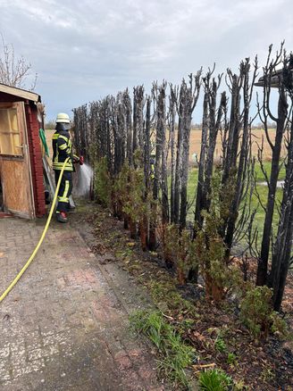 Am Mittwochmorgen wurde die Feuerwehr Hoya um 10.14 Uhr zu einem Einsatz in die Johann – Beckmann – Straße gerufen. Dort war eine Lebensbaumhecke in Brand geraten und drohte auf ein hölzernes Gartenhaus überzugreifen. 14 Brandschützer rückten daraufhin mit 2 Fahrzeugen aus und löschten die in Vollbrand stehende Hecke mit Wasser aus dem Tanklöschfahrzeug ab. Dank des schnellen Eingreifens der Feuerwehr konnte der Schaden am Gartenhaus gering gehalten werden, lediglich die Kunststoffdachrinne war aufgrund der Wärmestrahlung geschmolzen. Einsatzleiterin Petra Guder lies den Bereich noch mit einer Wärmebildkamera kontrollieren und so konnte der Einsatz nach ca. 30 Minuten abgeschlossen werden.