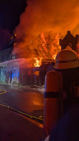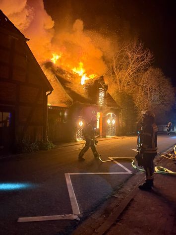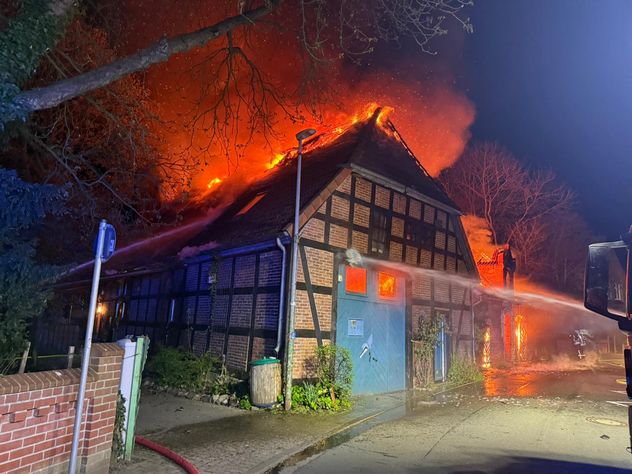 Ein Nebengebäude stand beim Eintreffen bereits in Vollbrand. Die Flammen schlugen aus dem Dach und griffen in kürzester Zeit auf den Dachstuhl des direkt angrenzenden Fachwerkhauses über. Gemeldet worden war das Feuer von einem aufmerksamen Nachbarn, der zugleich die beiden Bewohner aus dem Gebäude rettete. Auch zwei Esel konnten rechtzeitig in Sicherheit gebracht werden.